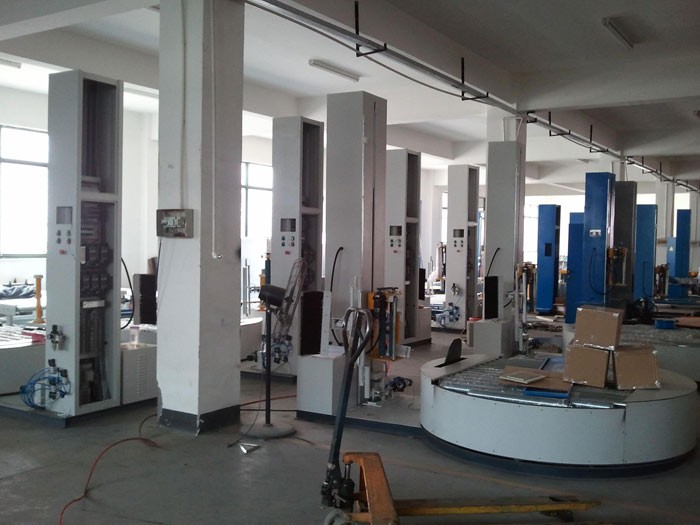 ² 轉盤減速后,夾緊汽缸動作,夾板豎起,纏繞膜將夾板和托盤一起纏繞